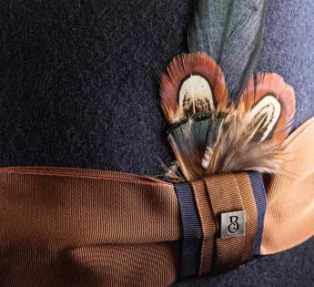 Sa forme compacte et raffinée est sublimée par un nœud satiné, rehaussé d'une plume discrète, évoquant une sophistication discrète. La légèreté du feutre offre un confort inégalé, tandis que la bague travaillée assure une tenue parfaite, mêlant tradition et innovation.
